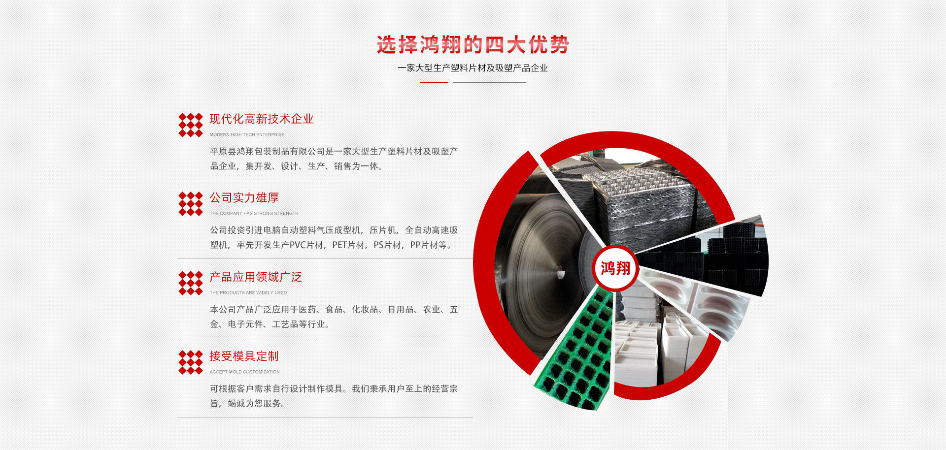 平原縣鴻翔包裝制品有限公司是一家大型生產(chǎn)塑料片材及吸塑產(chǎn)品企業(yè),本公司投資引進(jìn)電腦自動塑料氣壓成型機,壓片機,全自動高速吸塑機,率先開發(fā)生產(chǎn)PVC片材,PET片材,PS片材,PP片材等,鴻翔是國內(nèi)先進(jìn)的生產(chǎn)廠家之一。本公司產(chǎn)品廣泛應(yīng)用于醫(yī)藥、食品、化妝品、日用品、農(nóng)業(yè)、五金、電子元件、工藝品等行業(yè),也可根據(jù)客戶需求自行設(shè)計制作模具。本公司技術(shù)力量雄厚,生產(chǎn)設(shè)備工藝先進(jìn)。我們秉承用戶至上的經(jīng)營宗旨,竭誠為您服務(wù)。